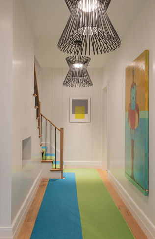 A young family wanted the benefits of suburban living while echoing the contemporary vibe of their Boston high-rise apartment. The 6,500-square-foot classic colonial had an open plan but lacked spatial separation between rooms. We opted to retain the sweeping feel of the first floor but added industrial transom windows between spaces, giving each area its separate mood. The clients are avid art collectors, so the living room became an opportunity to showcase their artwork. In the central foyer, the curved stairwell draws the eye with the addition of a custom wallcovering hand-designed by Elms. The kitchen was optimized for entertaining and dining around the table and the massive island. A rough-hewn beam wrapped in steel and a vintage streetlight fixture from Paris adds a cool factor that works equally well for a grownup cocktail party or homework duty.