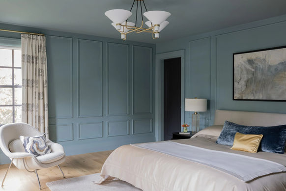 Lighting was also a key focus throughout the home: a white glass chandelier with sculptural edges adds unexpected tension to the dining room’s delicate palette. At the top of the stairs hangs a showstopping chandelier of interlocking Murano glass. This leads to a luxurious primary suite, complete with a soaking tub for tranquil self-care. The addition of dreamy blue paneling adds a cozy feeling to a previously nondescript guest room, while the daughter’s bedroom is warmed by cheerful blossom curtains and a sentimental mirror that had belonged to her mother. An unexpected moment awaits inside the basement door: a mural of palm tree fronds painted by hand by Patina Designs—a nod to New York City hotspot Indochine —which creates a visual transition to the swimming pool, transporting guests to a tropical retreat.